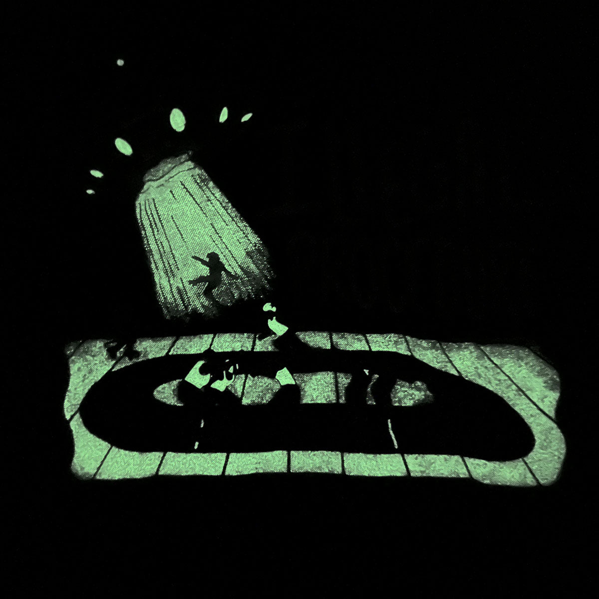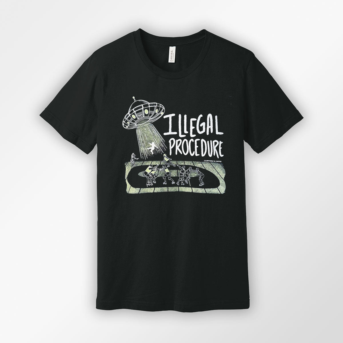 Add an electrifying twist to your roller derby wardrobe with our Illegal Procedure Unisex T-Shirt. This shirt not only glows in the dark, but it also features a one-of-a-kind roller derby track design and playful skater abduction graphic. Perfect for standing out on or off the track!