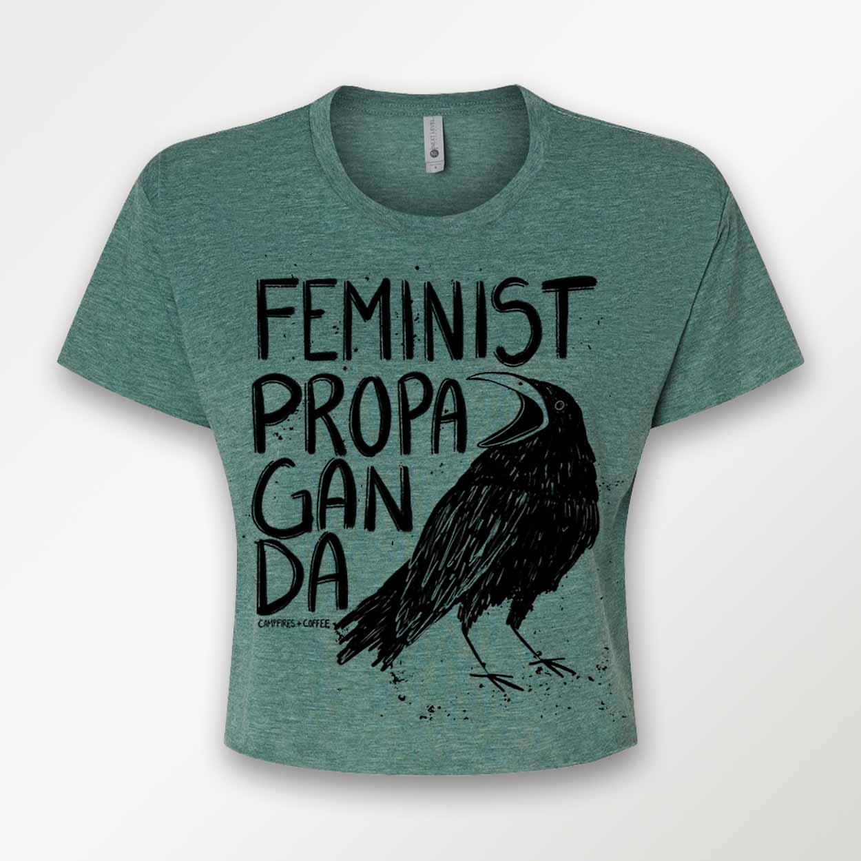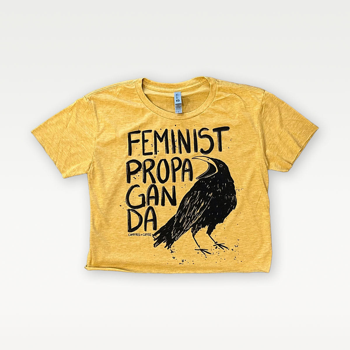 Show off your sassy side in this must-have Feminist Propaganda Crow Crop Top. This fun festival crop top features a black crow graphic and text reading "feminist propaganda," so you can let the world know who's in charge! Fly high in style with this snarky statement piece!
