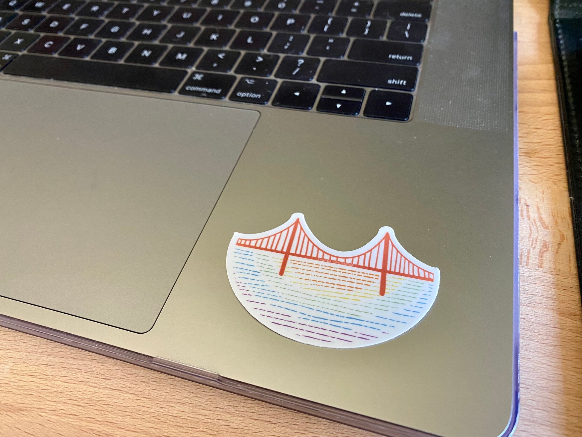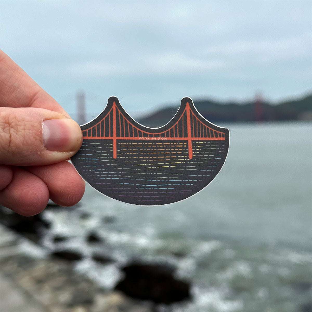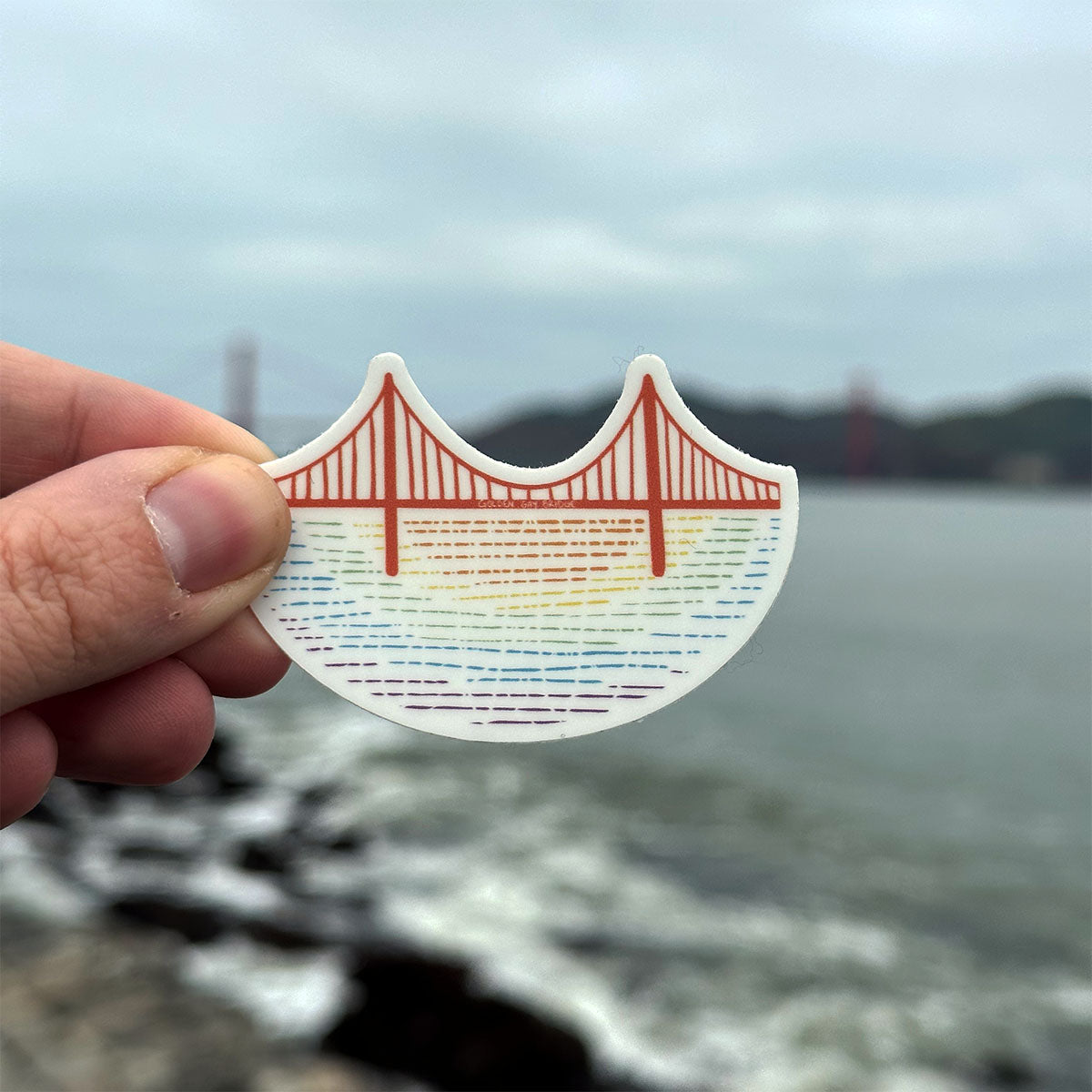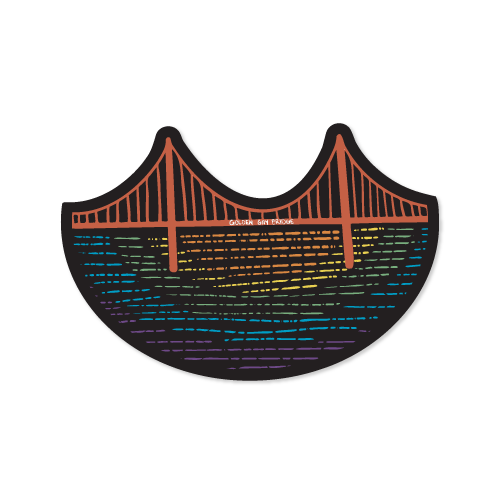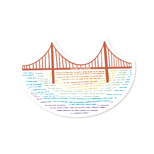 LGBTQ+ Pride stickers featuring San Francisco's Golden Gate Bridge. Available with a black or white background.