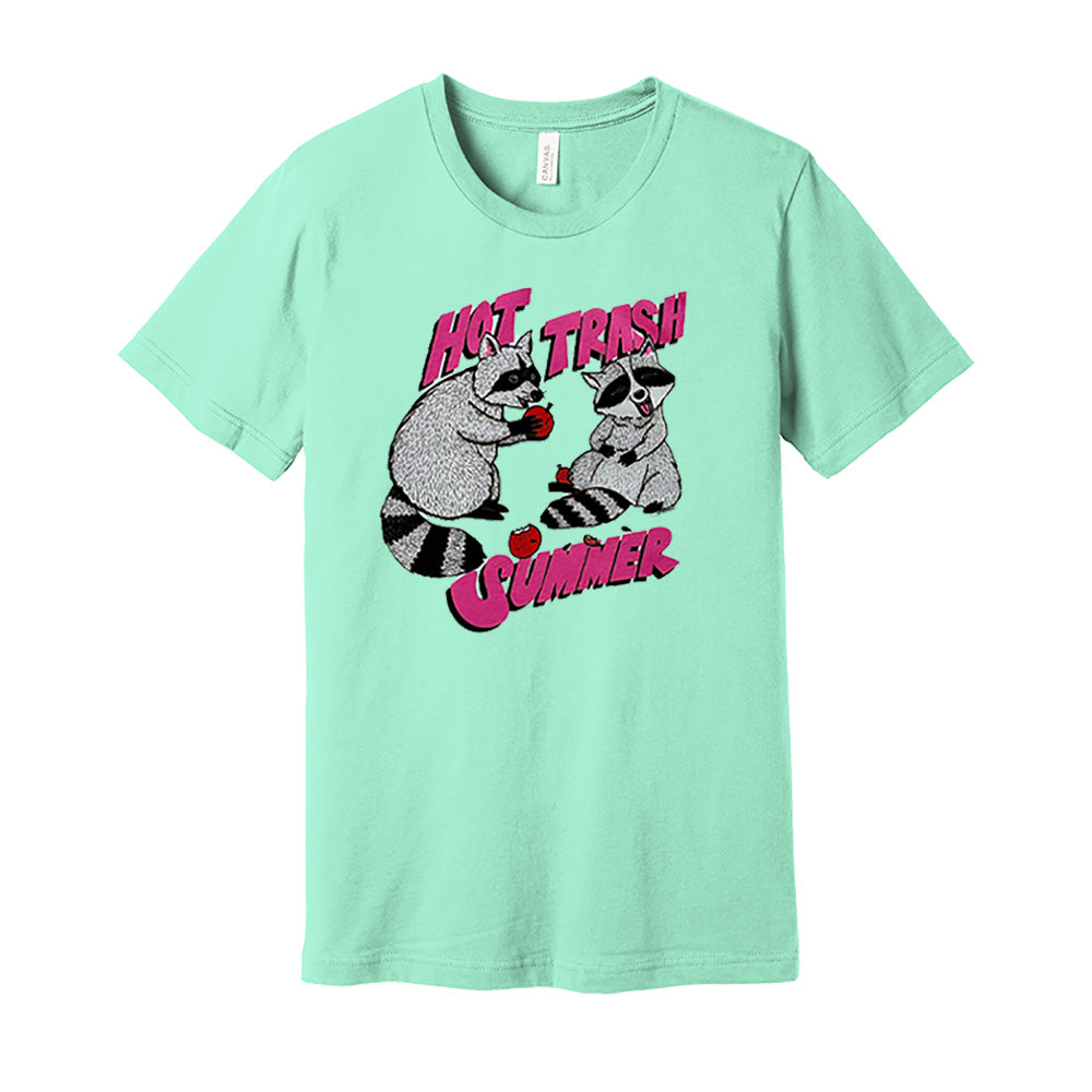 Look your best and stand out in this Hot Trash Summer T-Shirt. This fitted tee features drunk raccoons and crab apples with pink Hot Trash Summer text all on a stunning mint green. Be the life of the party with this stylish and unique tee!
