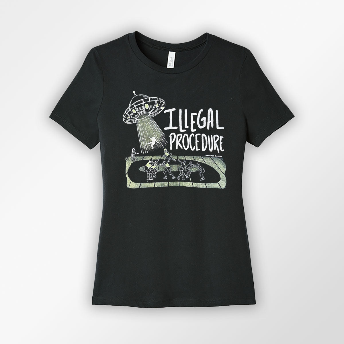 Add an electrifying twist to your roller derby wardrobe with our Illegal Procedure Feminine Cut T-Shirt. This shirt not only glows in the dark, but it also features a one-of-a-kind roller derby track design and playful skater abduction graphic. Perfect for standing out on or off the track!