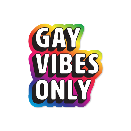 Rainbow LGBT Pride stickers with white text that reads “Gay Vibes Only.” This is a play on the phrase “good vibes only” but gayer.
