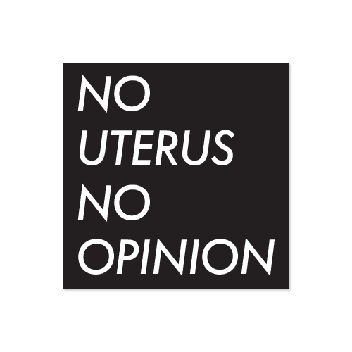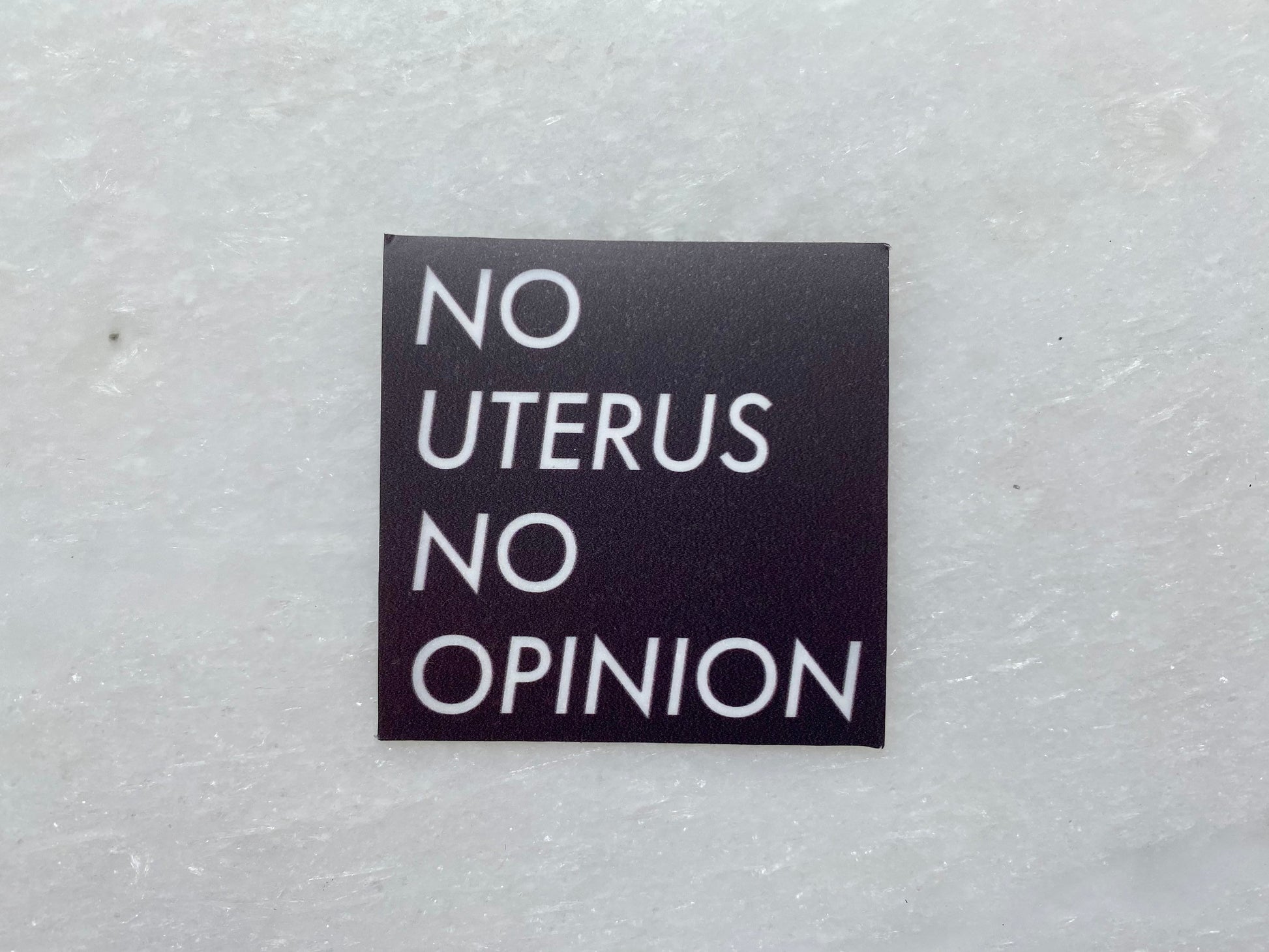 Black stickers with white text that reads “No Uterus No Opinion.” These stickers are waterproof!