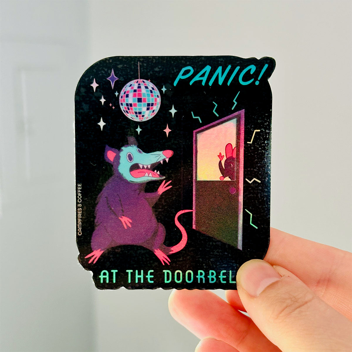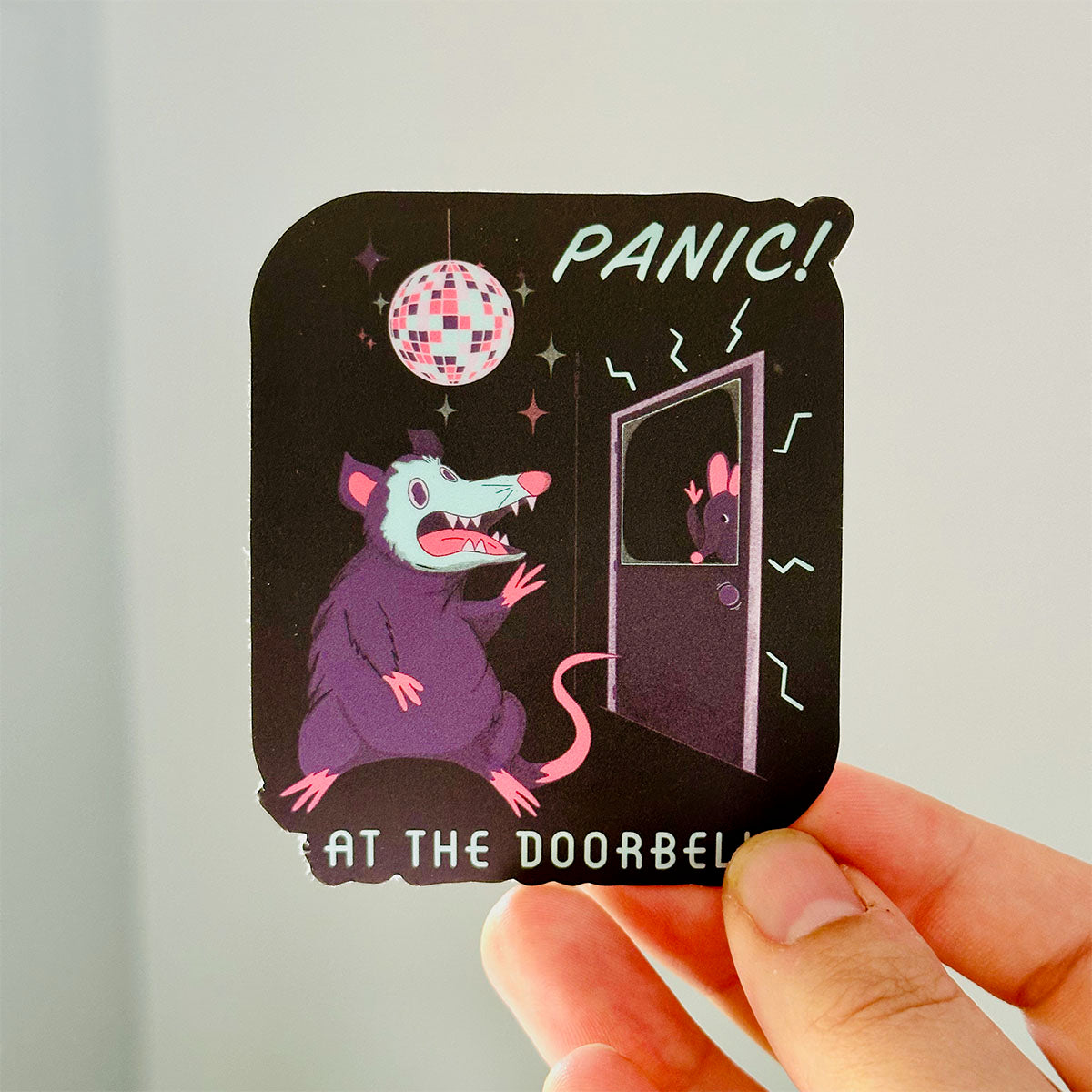 Introducing our "Panic at the Doorbell" vinyl sticker, featuring an anxious possum in a relatable moment. Stick it on your laptop, water bottle, or wherever you need a little chuckle.