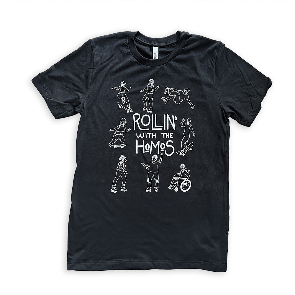 Show your pride and stay cool with the Rollin' with the Homos t-shirt! This soft tee is perfect for cruising with your gay friends and hitting the skate park. Featuring bold artwork and a retail fit, make a statement without sacrificing comfort. What are you waiting for? Let's roll!