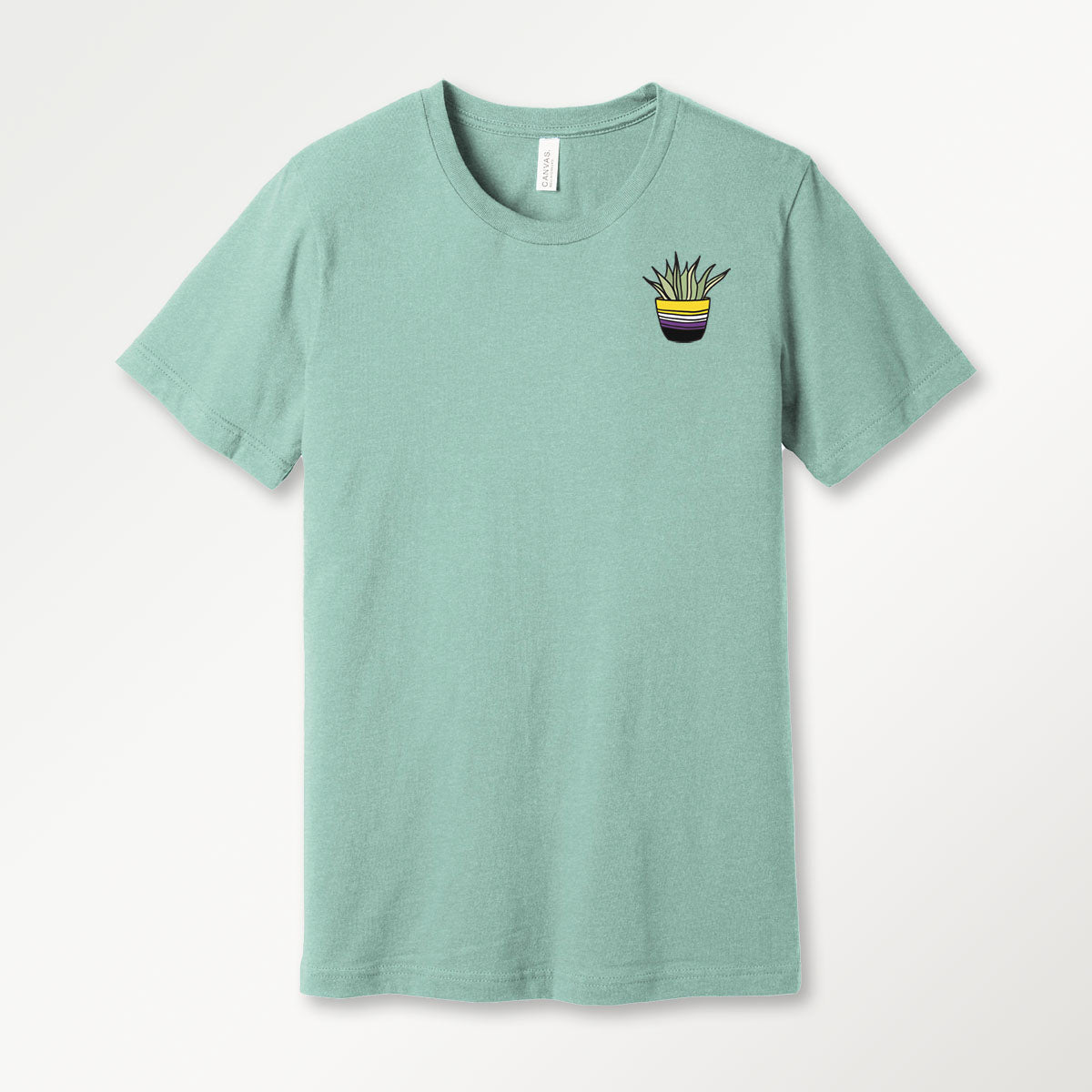 Show your pride with this unique and subtle Potted Plant LGBTQ+ Pride T-Shirt! Crafted from soft cotton for a comfortable fit, this eye-catching design captures the spirit of acceptance and inclusion with a colorful potted plant on the front and inspirational text on the back. Join the celebration!