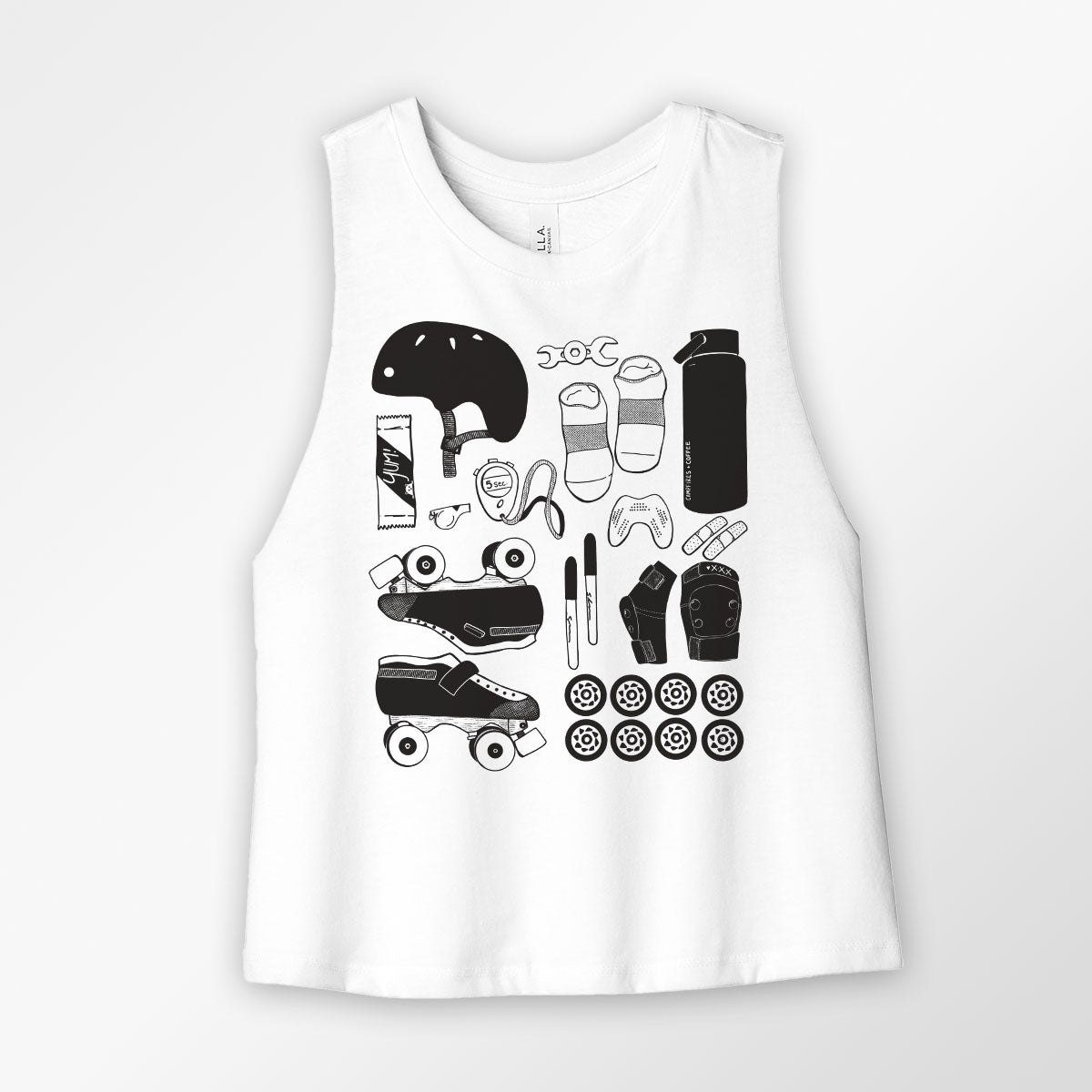 Get ready to roll with this quirky and fun racerback crop top! Featuring playful illustrations of roller derby essentials, this flowy and feminine top is perfect for showing off your love for the sport. With a unique cut and design, this top is sure to turn heads on and off the track. Game on!