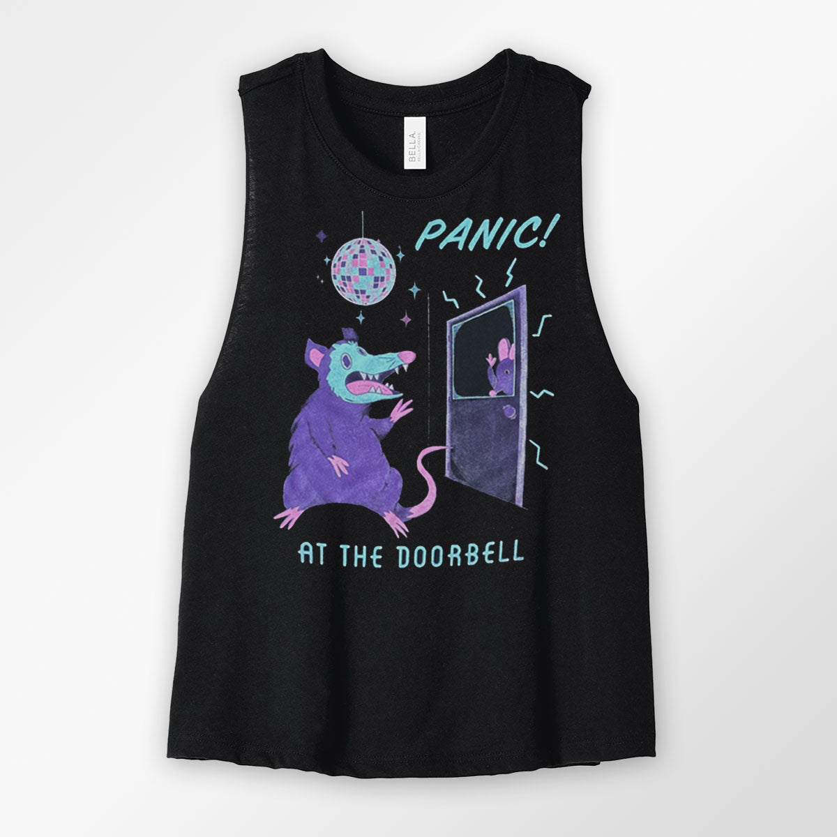 Keep the anxiety at bay with our Panic at the Doorbell Flowy Cropped Racerback Tank. Designed for the anxious person, this shirt features a panicky possum and a disco ball for some quirky relief (and maybe a dance party). Don't worry, no doorbells involved. (Seriously, who even uses those anymore?)